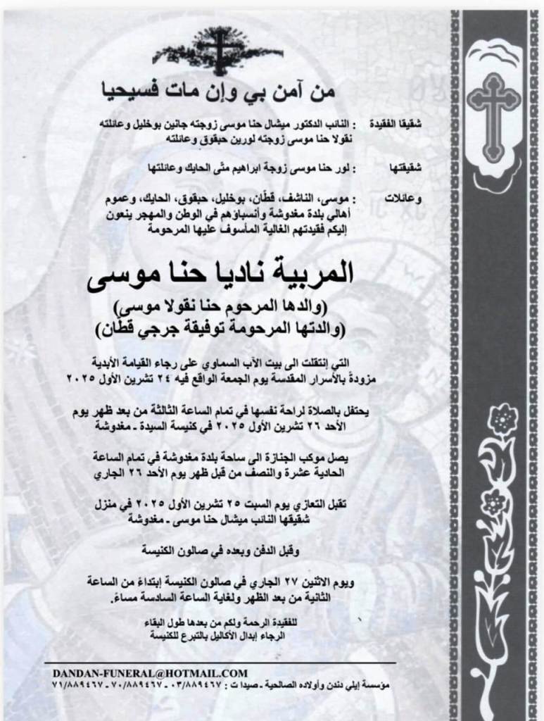 تقبل التعازي يوم السبت في 25 الحالي في منزل شقيقها النائب ميشال موسى في مغدوشة وقبل الدفن وبعده في صالون الكنيسة.