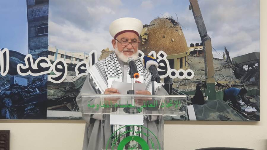 وفي الختام تلا رئيس مجلس علماء فلسطين الدكتور الشيخ حسين قاسم البيان الختامي جاء فيه: