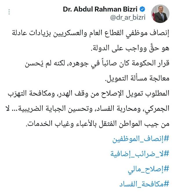الا ان البزري اكد في الوقت نفسه أنّ تمويل أي زيادات على رواتب موظفي القطاع العام والعسكريين يجب أن يأتي من خلال مكافحة الفساد ووقف الهدر وتحسين التحصيل الضريبي والتشدّد في مكافحة التهرّب الجمركي، لا من خلال تحميل المواطنين أعباء إضافية.